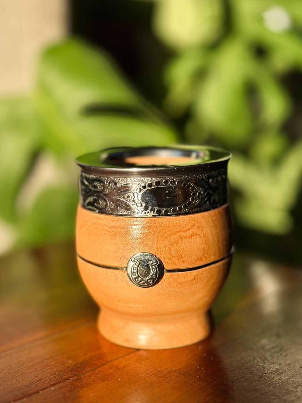 Mate de algarrobo con virola de acero y lazo con dije de alpaca