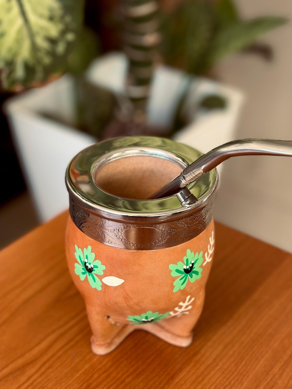 Mate imperial de madera de algarrobo, forrado en cuero, con virola de acero. Pintado a mano. El diseño de la virola puede variar.